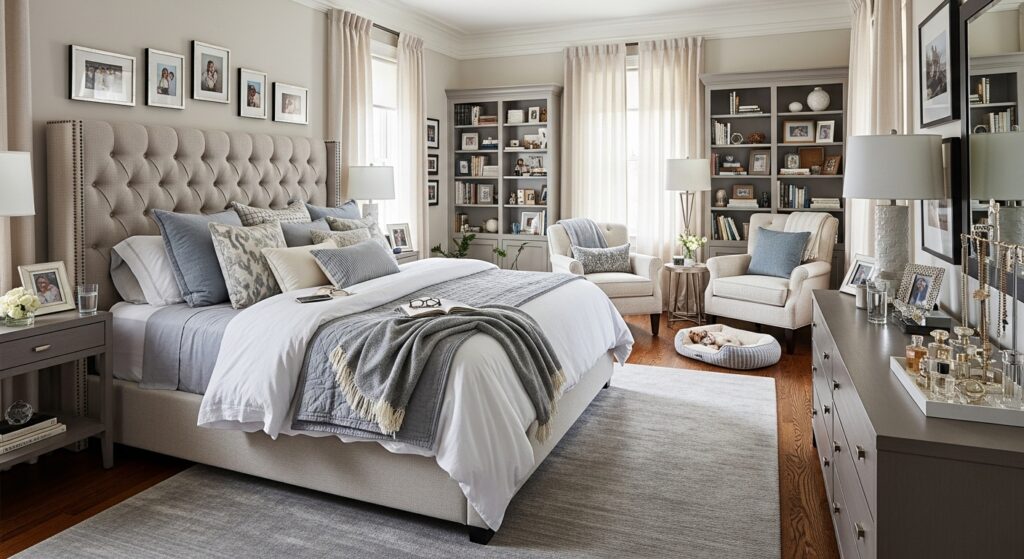 Step into tranquility. This thoughtfully designed bedroom offers a serene escape, where every element contributes to a sense of calm and understated elegance. Soft, neutral tones create a harmonious palette, allowing natural light to fill the space. From the cozy armchair in the reading nook to the meticulously arranged shelving and the subtle artwork, each corner is crafted for comfort and beauty. It’s a testament to how suitable colors and smart design can transform a room into a peaceful sanctuary.